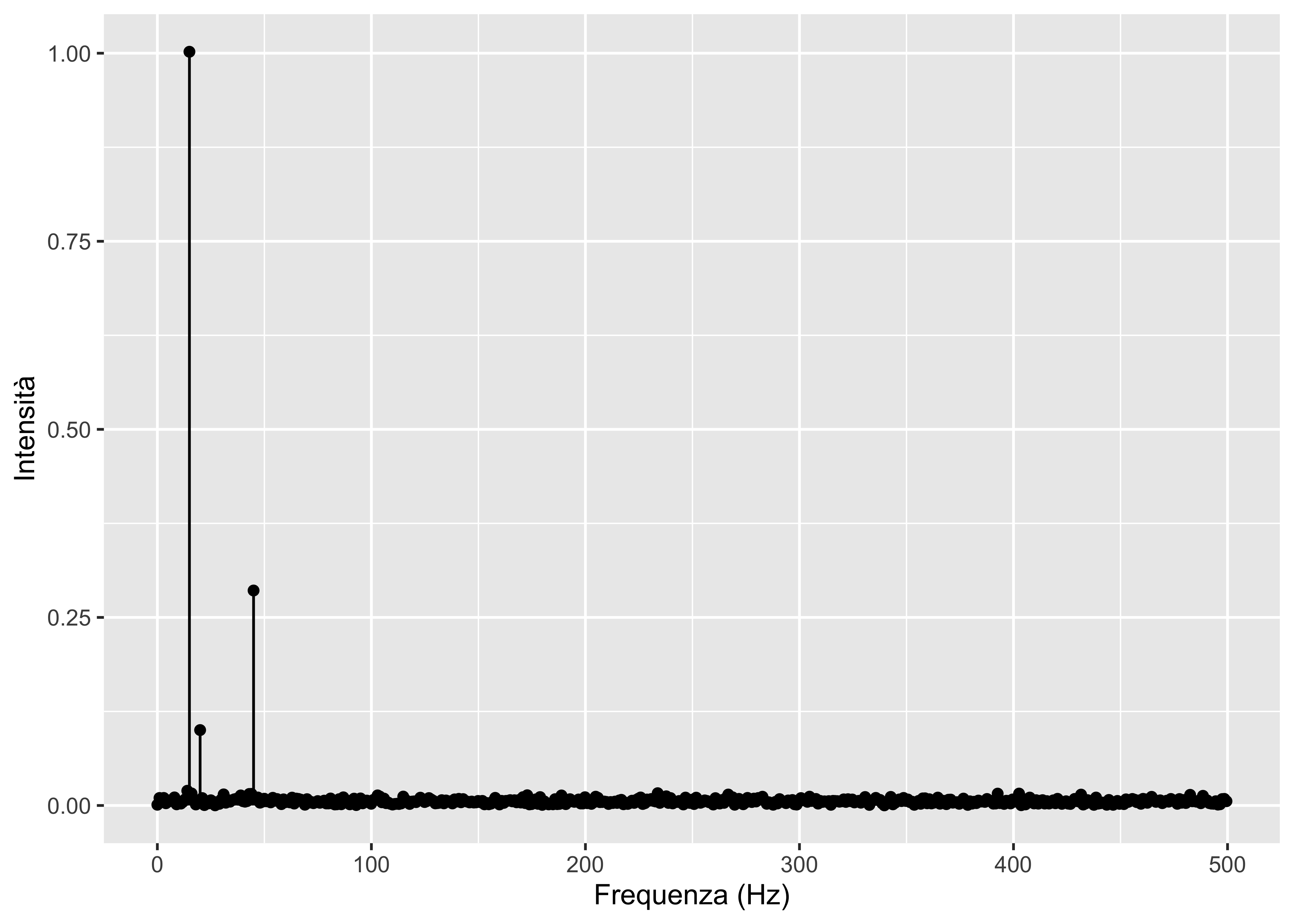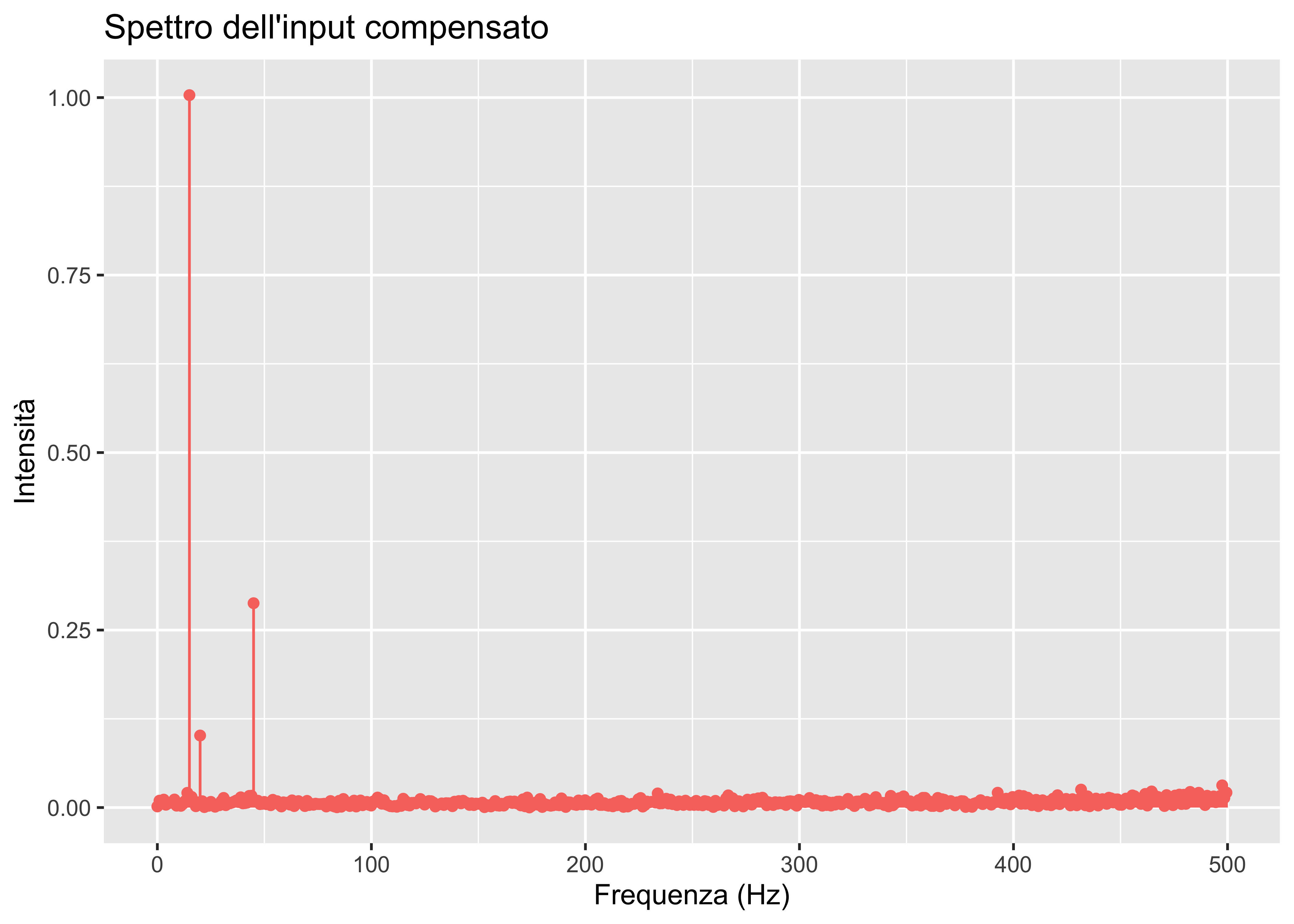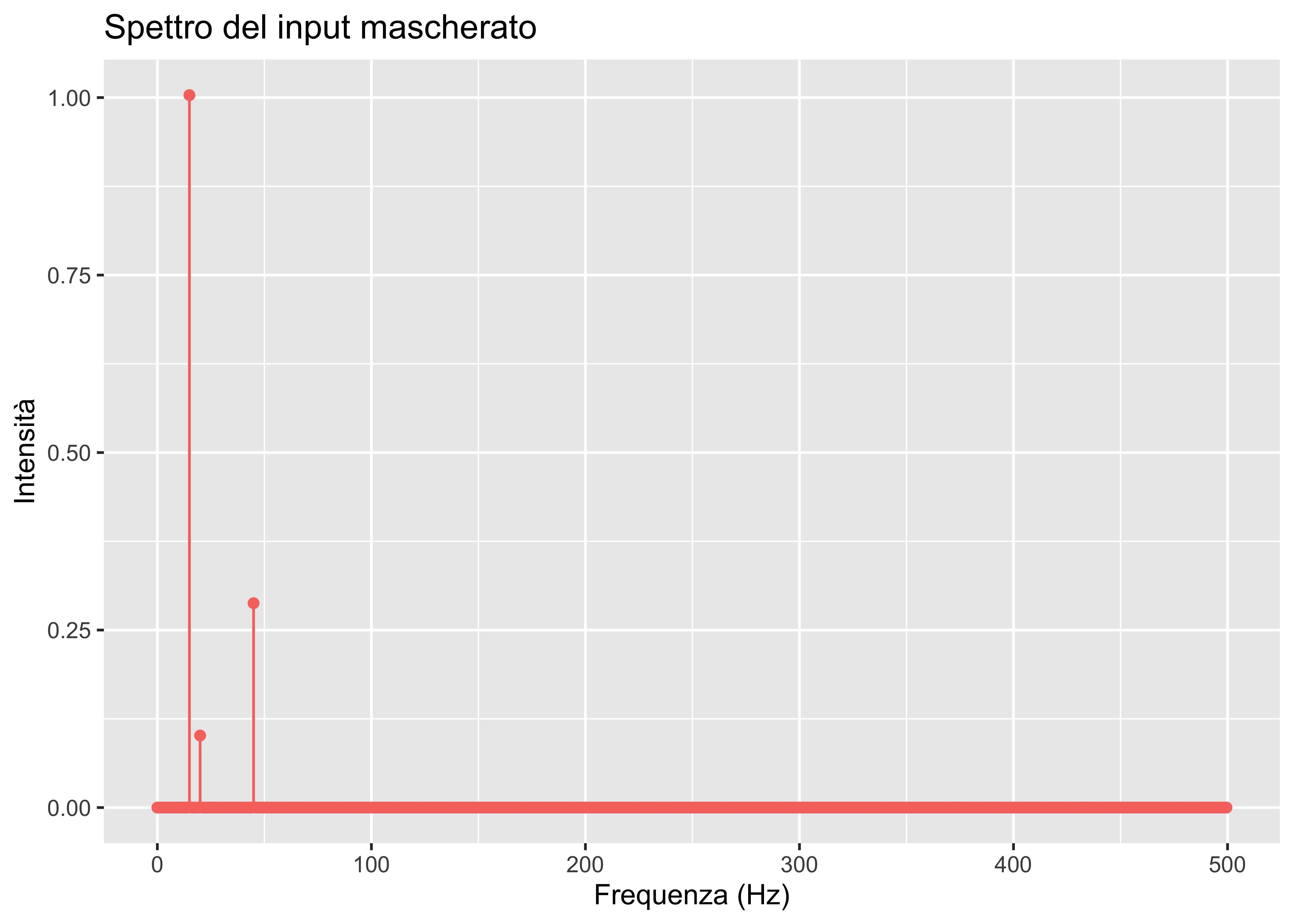 labs(x = "Frequenza (Hz)", y = "Intensità", title = "Spettro del input mascherato")