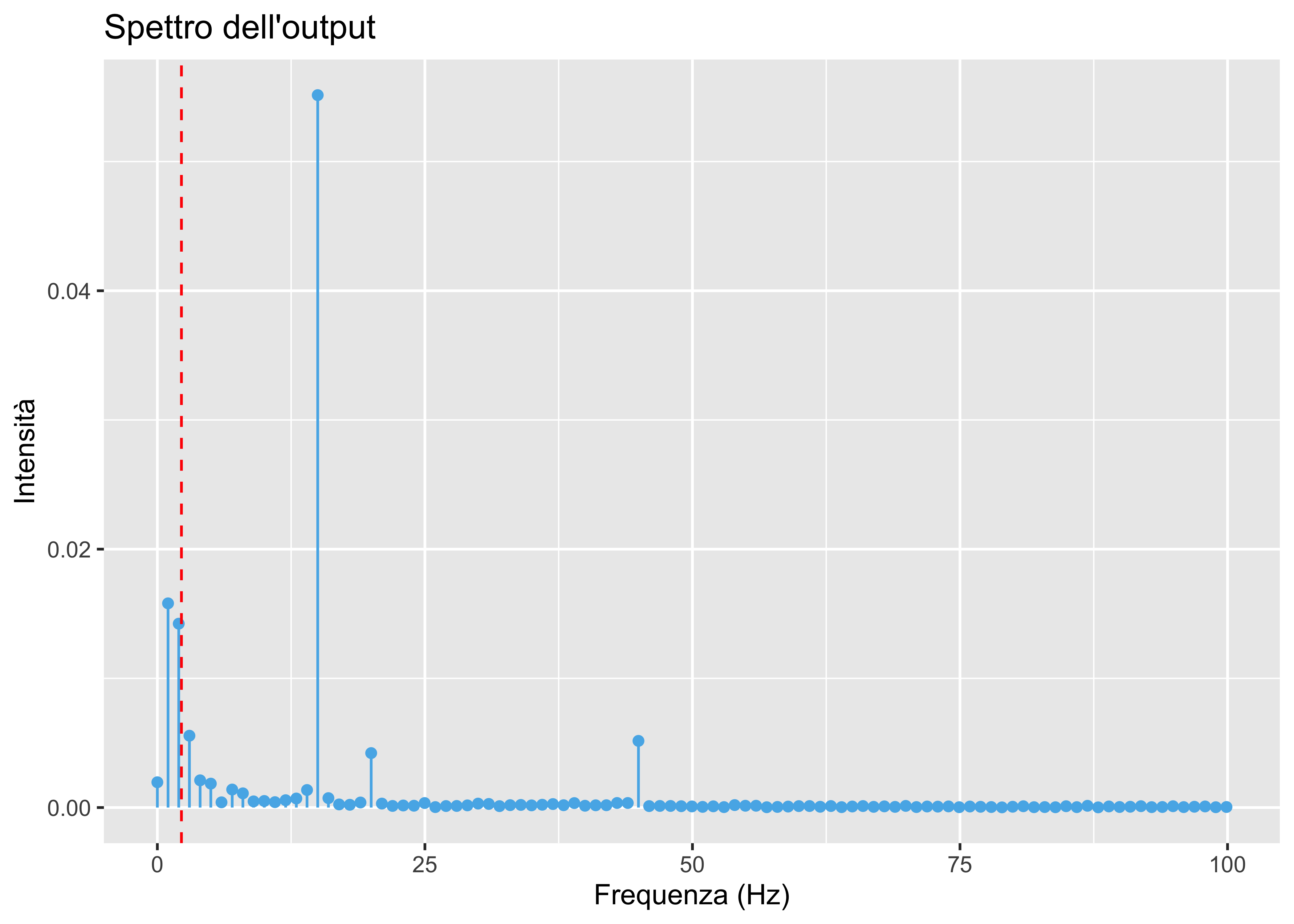 Sulla base dei diagrammi di bode ed osservando lo spettro dell’uscita che segue, è evidente che le componenti oltre i \(2.25\,\mathrm{Hz}\) verranno amplificate.